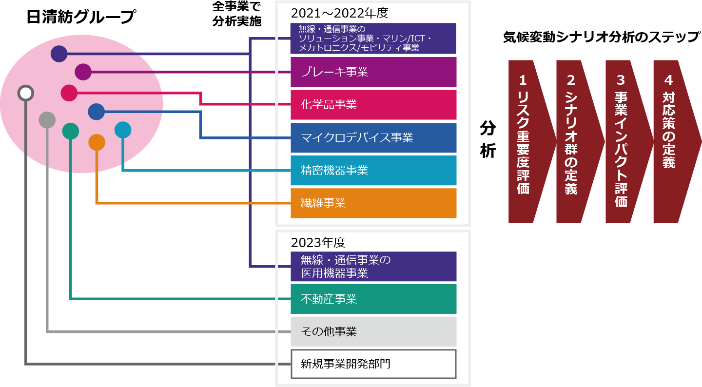 日清紡グループは事業が多岐にわたるため、2021年度から段階的に気候変動シナリオ分析を実施し、2023年度において当社グループの主要事業の分析が完了※ しました。2021年度はリスク・機会のインパクトが大きいと想定される事業として、無線・通信事業におけるソリューション事業、ブレーキ事業、化学品事業を対象に、2022年度は無線・通信事業におけるマリン/ICT・メカトロニクス/モビリティ事業、マイクロデバイス事業、精密機器事業、繊維事業を対象とすることで、生産活動を伴う主要事業での分析を実施しました。2023年度は、無線・通信事業における医用機器事業、不動産事業、その他事業のほか、新規事業開発部門における取り組みも対象としました。使用した気候変動シナリオは、温暖化が進行する世界(温暖化進行シナリオ、2.5~4℃シナリオ)と、温暖化が抑制され積極的な移行が進む世界(脱炭素シナリオ、1.5~2℃シナリオ)という2つのシナリオに対し、以下のステップで気候変動シナリオ分析を実施しました。